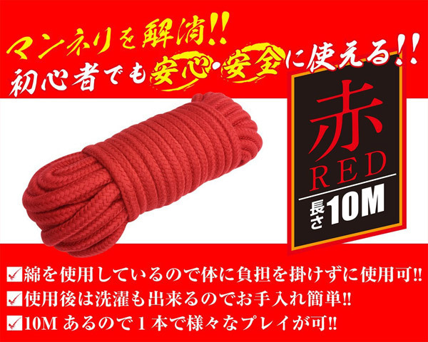 - 初心者でも簡単♪ソフトSMにぴったりな綿素材を使用した緊縛ロープ「簡単拘束ロープ 赤」。