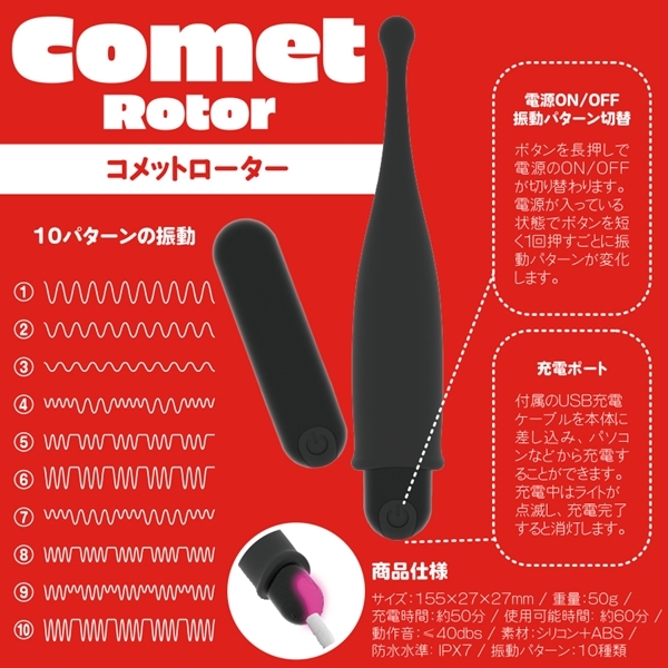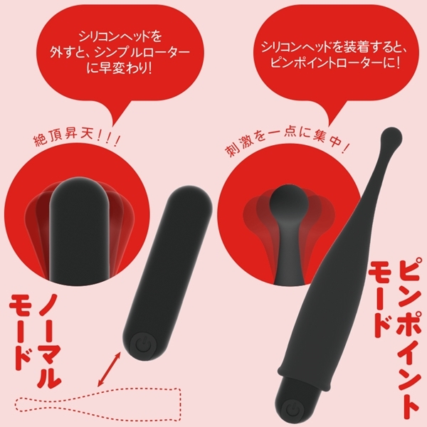 - 初心者でも扱いやすいピンポイントローターです♪ヘッド部分には肌触りの良いシリコン素材を使用し、小型ながらもパワフルな刺激をお届けします!狙ったポイントを的確に刺激できるピンポイントモードと、シリコンヘッドを外して使用するノーマルモードの2WAY仕様♪ワンボタンで簡単に操作でき、10種類の振動パターンからお好みの刺激を選べます!IPX7等級の完全防水なので、お風呂などでも使用可能です♪