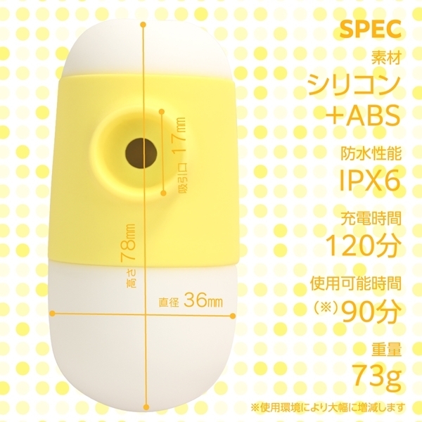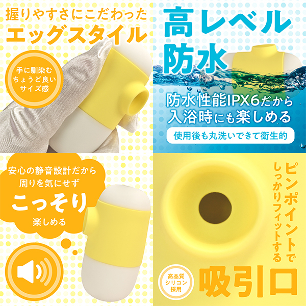 - 手にフィットするエッグスタイルの吸引ローターです♪可愛らしいデザインに、高性能な静音モーターを搭載しています!タマゴ型フォルムの上部にボタンを配置し、片手でもスムーズに操作可能です♪吸引口には柔らかく高品質なシリコン素材を採用し、ピンポイントにしっかりフィットして快適な真空状態を演出!7パターンの吸引アクションを搭載しており、強弱の調整も自在に楽しめます♪約120分で満充電でき、最大約90分間の連続使用が可能!(使用環境により変動します!)さらにIPX8相当の高い防水性能を備えているため、使用後も丸洗いできて衛生的です♪コンパクトながら多機能な、使いやすさにこだわったアイテムです!