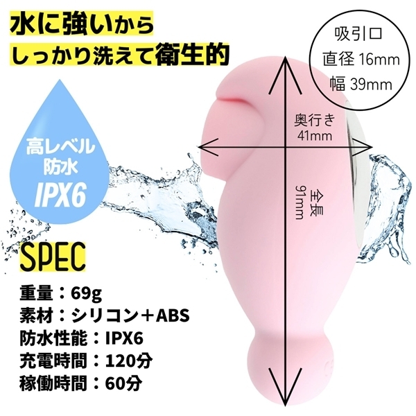 - 吸引と振動を同時に楽しめるコンパクトな外用グッズです♪吸引口上部にマイクロモーターを搭載し、吸われながらブルブル振動のW刺激を演出!吸引は強弱3段階と4つのリズムパターン、振動は5段階の強弱調整と7つのリズムパターンを搭載し、それぞれ自由に組み合わせ可能です♪直径16mmの吸引口がしっかりフィットして、快適な使い心地を実現!本体は全長10cm以下とコンパクト設計で、重さもわずか69gなので手が疲れにくいのもポイントです♪静音設計とIPX6相当の防水性能で、使用後も丸洗いできて衛生的!(使用環境により大幅に変動します!)滑らかで肌ざわりの良いシリコンボディが快適な使用感をサポートします♪