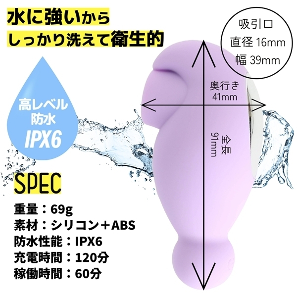 - 吸引と振動のダブル刺激を同時に楽しめるコンパクトグッズです♪吸引口上部にマイクロモーターを搭載し、吸われながらブルブルとした振動が心地よい刺激を演出!吸引は強弱3段階と4種類のリズムパターン、振動は5段階の強弱調整と7つのリズムパターンを搭載しています♪それぞれを自由に組み合わせて、自分好みのパターンを楽しめます!吸引口は直径16mm設計で真空刺激がしっかり伝わる仕様です♪本体は全長10cm以下のコンパクト設計、重さもわずか69gで持ちやすく手が疲れにくいのも魅力!(使用環境により使用時間は変動します!)静音設計+IPX6相当の防水仕様で、使用後もしっかり洗えて清潔に保てます♪肌ざわりの良いシリコンボディで快適な使い心地を追求しました!