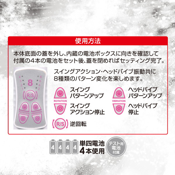 - パッケージ:23.2×7.5×4.0cm 本体:21.7×3.4cm 重量:134g 電池:単四電池×4本使用