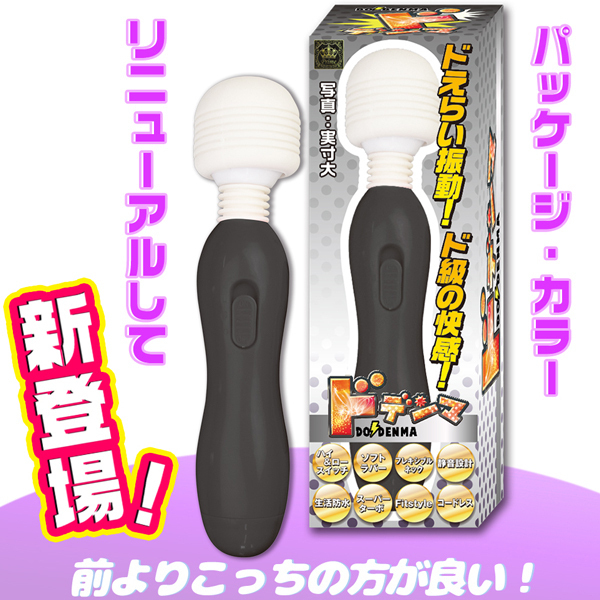 - ドえらい振動がドドーンと炸裂!超ド級の握り易さもめっちゃ嬉しいお手軽電マ『ドデンマ』がより可愛いカラーになって新登場!パッケージもリニューアルし、ソフトラバーヘッド&フレキシブルネックだから優しい当て心地です♪耳障りな音をカットした静音設計になっておりスイッチは使いやすい強弱2段階!カラー:ブラック