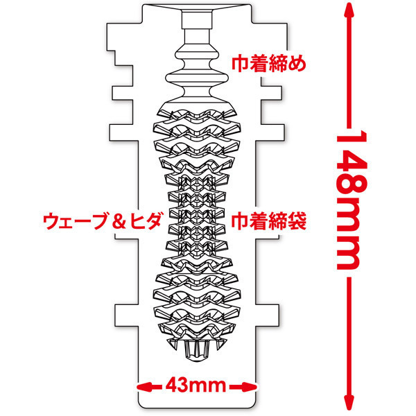 巾着袋を締めたような入り口と奥が膨らんだ名器仕様のオナカップ!きつめの入り口を通過すると絡みつくウェーブとヒダがひしめく内部構造になっています。