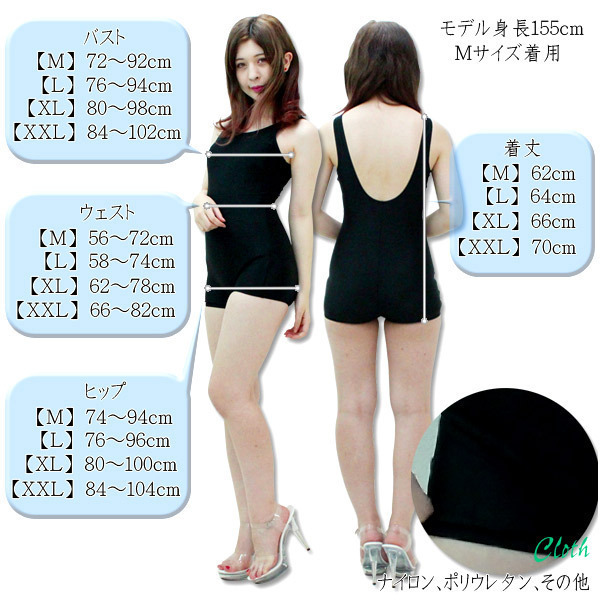- XLサイズ:B80〜98cm・W62〜78cm・H80〜100cm 着丈66cm セット内容:水着単品(前身頃全面に裏地付き、胸部にパット付き) 素材:ナイロン、ポリウレタン、その他