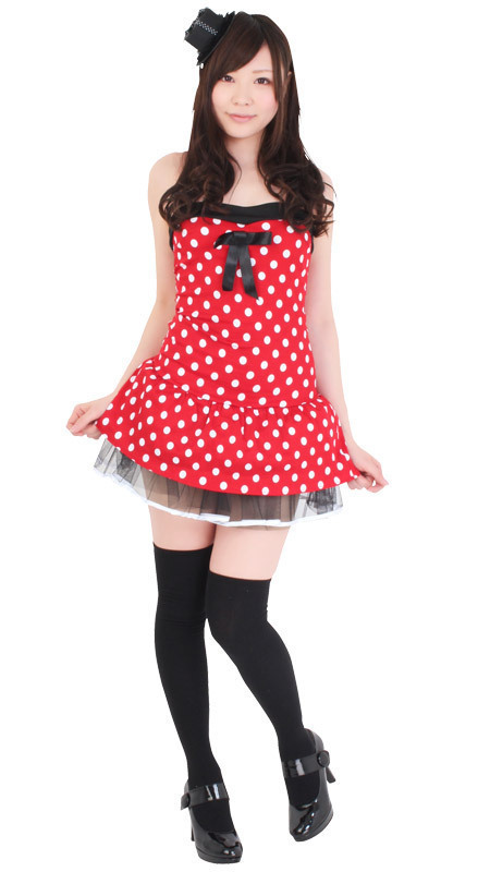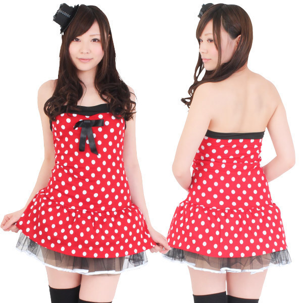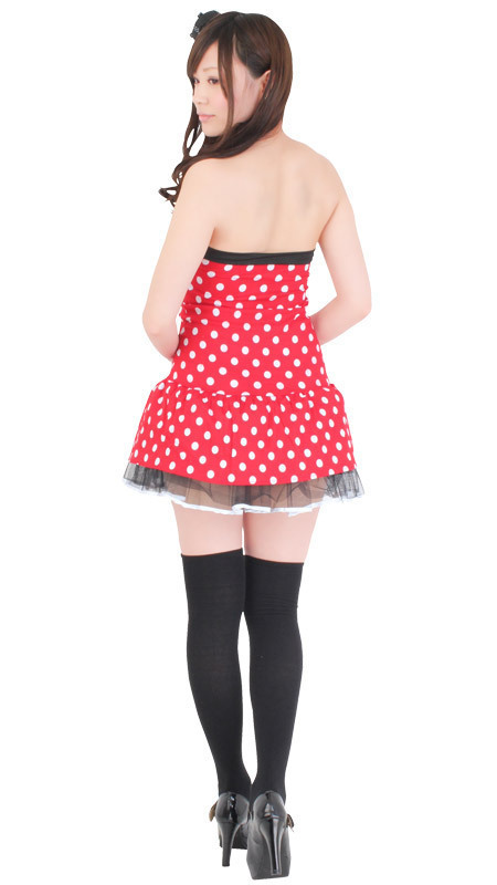 - 赤地に白のドット柄がとっても可愛いミニーチューブトップ!セクシーな肩出しワンピースの胸中央にある黒いリボンが、さらに可愛さを引き立たせます!スカート部分は女の子らしいチュール素材でふんわりと仕上げたコスチュームです。