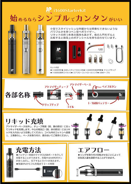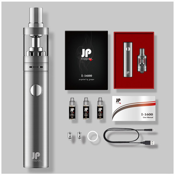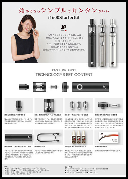 - 快適なVAPE(ベイプ)ライフをすぐに始められる特製BOX入りのフルセット!電子タバコのペン型ヴェポライザー「JPvapor I-1600 スターターキット シルバー」。