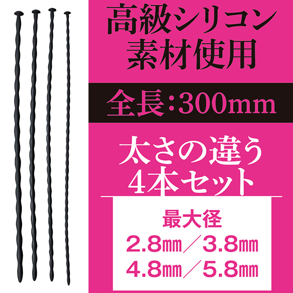 - あなたの尿道を覚醒させるシリコン製の「極細シリコンプラグ」!それぞれ太さの違うシリコンカテーテルの4本セット♪長さが十分あるので本格的なサウンディングプレイをお楽しみいただけます!4サイズともにそれぞれ径が違いますが、ビギナーからでも始められそうなサイズ感となっております♪先端部分は先細で挿入しやすく、表面にはデコボコ加工が施され、底部はストッパーになっているので安心感もあります。