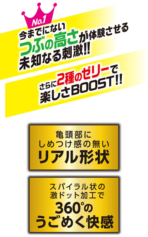●スパイラル状のツブ突起を360度ぎっしり配置●先端女性側:HOTに感じるゼリー剤を塗布●側面ツブ上:サラッとした潤滑剤を塗布●亀頭部を締め付けないごく自然な使用感●装着感を与えない無着色タイプ。