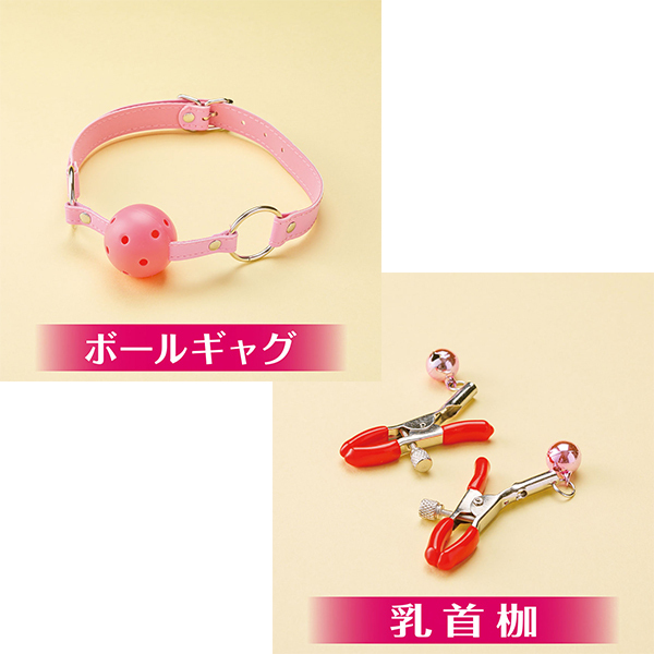 本体:アイマスク(8.0×19.0cm)、ボールギャグ(ボール直径4.5cm・バンド長さ最大63.0cm・幅2.0cm)、リード付き首輪(首輪長さ最大51.5cm・幅5.5cm・リード長さ95.0cm)、乳首枷(7.0×3.0cm×2個)、手枷(長さ最大32.0cm・幅5.0cm・チェーン長さ10.0cm)、足枷(長さ最大37.0cm・幅5.0cm・チェーン長さ10.0cm)、手枷足枷十字連結(31.0×31.0cm)、バラムチ(全長62.0cm)、フェザー(全長27.0cm)、ロープ(全長55.0cm・太さ0.8cm)